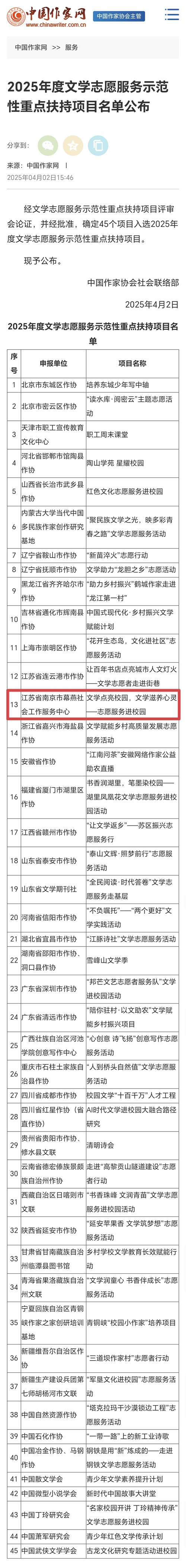 4月2日,中国作家协会2025年全国文学志愿服务示范性重点扶持项目评选结果公布,全国共有45个项目入选,其中,由南京市作协组织申报的南京市幕燕社会工作服务中心“文学点亮校园,文学滋养心灵——志愿服务进校园”项目成功入选。