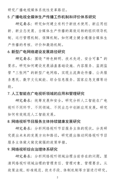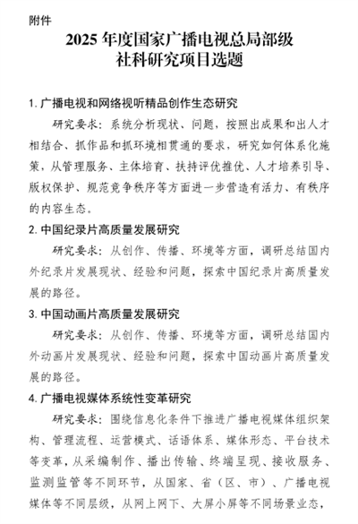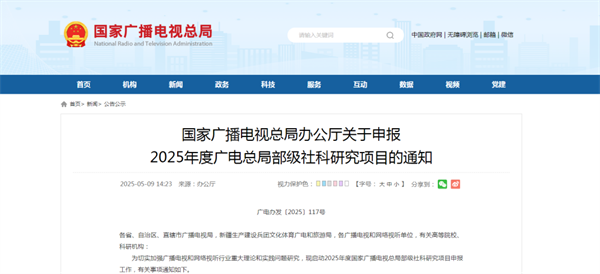 近日,国家广播电视总局发布《国家广播电视总局办公厅关于申报2025年度广电总局部级社科研究项目的通知》。