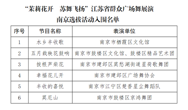 “茉莉花开 苏舞飞扬”江苏省群众广场舞展演南京选拔活动入围名单公示