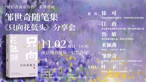 11月2日,邹世奇将带着她的随笔集《只向花低头》,与我们在南京图书馆相遇。