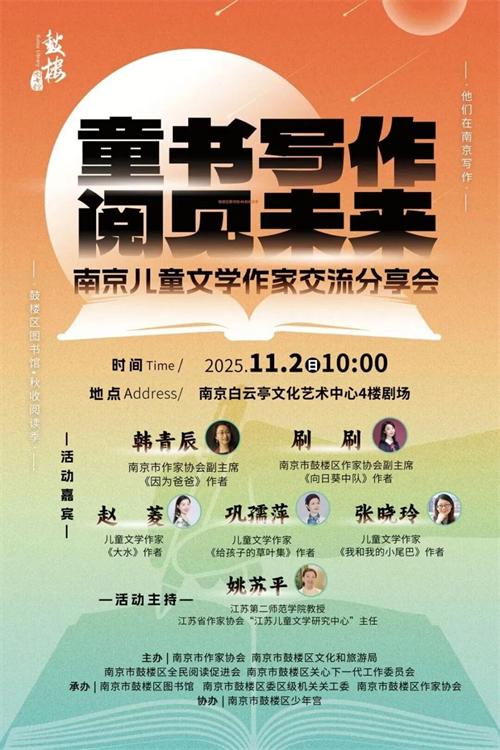 2025年11月2日(周日)10:00,南京市作家协会将在鼓楼区图书馆举办“童书写作 阅见未来——南京儿童文学作家交流分享会”。