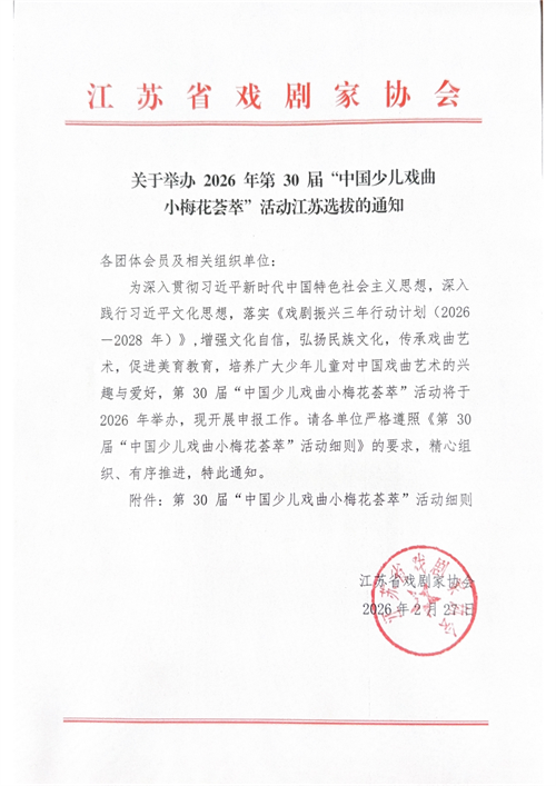 根据《2026年第30届“中国少儿戏曲小梅花荟萃”活动细则》及江苏省戏剧家协会申报工作安排,现启动南京市第30届“中国少儿戏曲小梅花荟萃”活动申报工作,报送截止日期3月23日。具体事项如下: