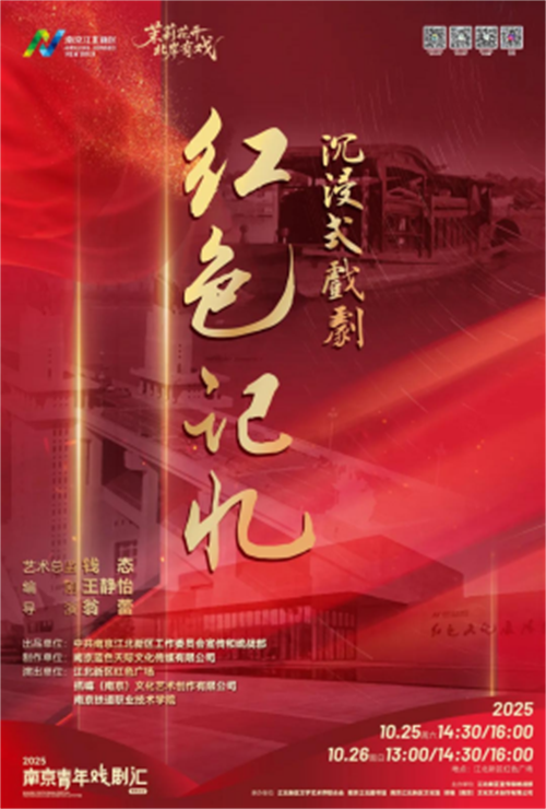 沉浸式戏剧《红色记忆》通过讲述中国共产党早期领导人之一、中国工人运动先驱之一、中共中央监察委员会首任主席王荷波同志,两浦雨花英烈、三浦战役烈士等江北革命者,以及以仇一、李承干、花儿等为代表的江北百姓的故事,再现了大革命时期的“二九”卧轨斗争,土地革命斗争时期的中共南京市一大、中共南京市二大,抗日战争时期的新四军江北地下交通网,解放战争时期的永利铔厂护厂运动、渡江战役等场景,描绘了在党的领导下,江北地区军民同心、英勇斗争的革命历程画卷。