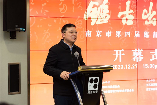 2023年12月27日下午,由南京市文学艺术界联合会、中共南京市高淳区委宣传部指导,南京市书法家协会、南京市高淳区文学艺术界联合会主办,南京市高淳区书法家协会、江苏高淳陶瓷股份有限公司承办的“鉴古出新”南京市第四届临书作品展在高淳陶瓷博物馆隆重开幕。南京市文联党组书记、常务副主席陈政,市文联党组成员、副主席毛敏,高淳区委常委、宣传部部长、文联主席杨勇,高淳区人大常委会副主任胡长明,高淳区政协副主席邢先文,江苏省书协副主席、南京市书协主席谢少承,南京市书协执行主席朱敏出席开幕式。