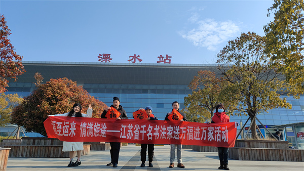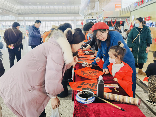 1月26日,在南京南站,由江苏省文学艺术界联合会和江苏省书法家协会等单位联合主办的“我们的中国梦”“万福迎春”2024福至运来 情满旅途——江苏省千名书法家送万福进万家活动启动仪式上,南京市书协组织近120名书法家用手中的毛笔、以中国书法特有的温度,将新春祝福通过铁路交通送到千家万户,让墨香润物细无声地滋养人们的心灵,让广大群众既品味了传统文化习俗,又感受了中国书法独特的文化魅力。接下来的一周时间里,市书协按照省书协要求,组织书法志愿者小分队坚守南京南,每天为来往的旅客送春联、“福”字,将温暖和吉祥的新春祝福捎去远方。