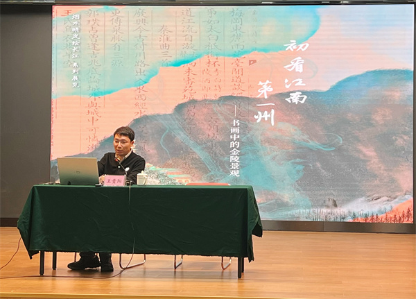 首场专题讲座特别邀请了南京博物院古代艺术部馆员王贵阳老师作题为《长江文化与江南城市——以烟水晴岚绘长江系列展览为例》的专题讲座。王老师以书画系列展览“烟水晴岚绘长江”为切入点,从展览第一部分南京城内的“随园寻迹”,到第二部分从城内走向城外的“金陵梦华”,再到第三部分由古及今进入“今人古月”,重在强调文人通过诗词文学和书法绘画对客观风景的塑造与文化构建,也在论述长江文化与南京城市文化之间的关系。讲座后,相关人员还实地参观了“初看江南第一州——书画中的金陵景观展”。
