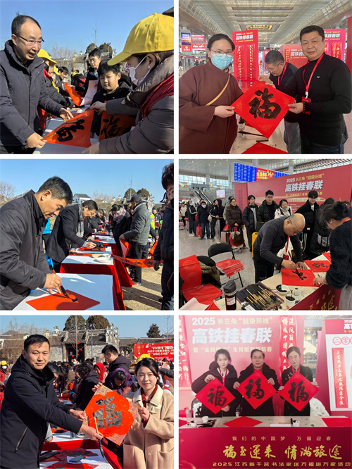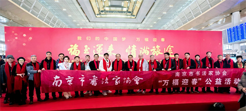 1月14日,在铁路南京南站,由江苏省文学艺术界联合会和江苏省书法家协会等单位联合主办的“我们的中国梦”“万福迎春”2025福至运来 情满旅途——江苏省千名书法家送万福进万家活动启动仪式上,南京市书协组织近130名书法家用手中的毛笔,以中国书法最特有的温度将新春的祝福通过铁路交通送到千家万户,让墨香润物细无声地浸润百姓的心灵,让广大群众既品味了传统文化习俗,又感受了中国书法独特的文化魅力。 从1月15日开始,市书协组织书法志愿者小分队驻守南京南,坚持为期一周的写春送福活动,每天为来往的旅客送春联福字,让旅客把温暖和吉祥的新春祝福带回家乡、带去远方。