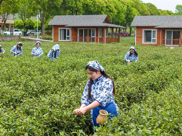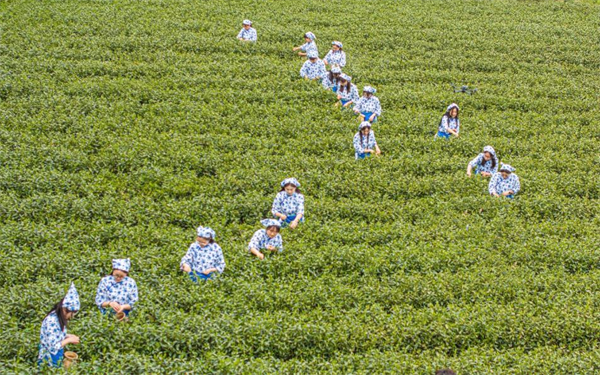 采茶小姐姐们穿梭在茶树间,熟练地采摘着鲜嫩的茶芽,那专注的神情仿佛在与大自然对话,辛勤劳作的身影与嫩绿的茶园融为一体。
