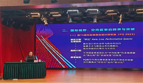 孙教授以国际视野与本土实践双重视角为切入点,将讲座内容分为三层递进展开。首先,他通过第16届布拉格舞台设计四年展(PQ 2023)的“罕见”主题展、奥地利布雷根茨湖上歌剧《自由射手》为例,重点剖析了当代空间叙事的跨界融合趋势与边界突破。在回归中国语境的探讨中,他提出“叙事空间化”“场域表演化”“技术融合化”三大探索路径,指出当下舞美设计正从传统剧场走向遗址、城市空间与数字空间,AIGC、数字孪生、沉浸式光影语言等新技术,成为推动空间叙事创新的重要力量。