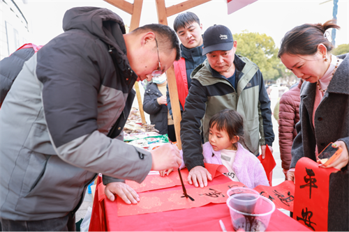 1月24日上午,2026年新春楹联“撰、书、挂”活动走进菜棚美食街。“非遗寻年味·新春‘福’满街”,江宁区书法家协会组织书法家们现场写春联、送“福”字,热闹的烟火市集里有了浓浓的文化氛围。