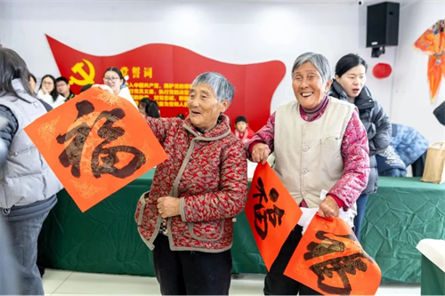 2月6日,送“福”的脚步更加密集。上午,南京市书法家协会“万福迎春”活动走进江宁区禄口街道山阴村,市书协主席带队为村民们写春联送“福”字。