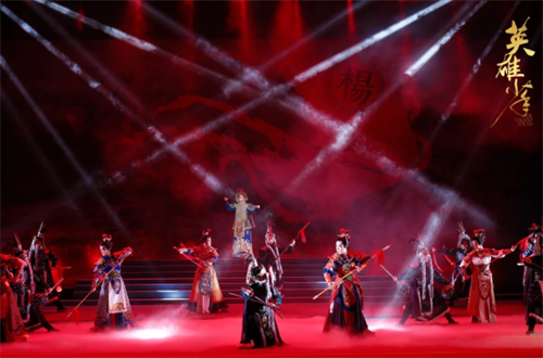 舞台之上,一组浮雕式烽火长城意蕴的立面屏风宛若时空之门巍然矗立,开合之间,天波杨府、演武校场、九层塔楼次第浮现,转瞬又在光影流转间化作杨令公梦境中金沙滩的断壁残垣。灯光、天幕、吊景的流动变换,配合纵向延展平台,构建出虚实相生的空间叙事,汴梁城的盛世繁华,金沙滩战场的烽烟蔽日,英雄心象的荡气回肠在此交织,共同组合成一幕幕流动的、写意的、充满灵性的戏剧场景。