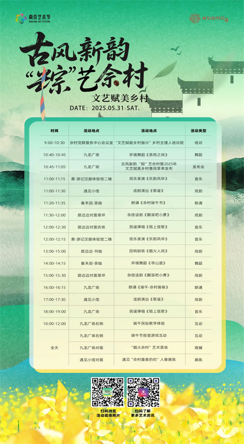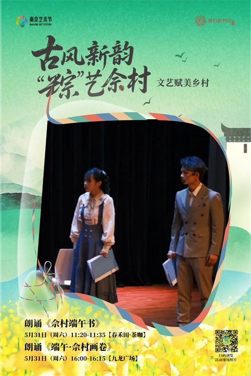 5月31日,15场艺术活动在村落开展。戏剧、舞蹈、音乐、朗诵、展陈、发布会、创业培训,还有九龙广场的“粽”艺佘村特别互动点位、充满创意与烟火气的现场艺术菜场。端午节在这里逛吃逛玩,丰富您与佘村的美丽邂逅。