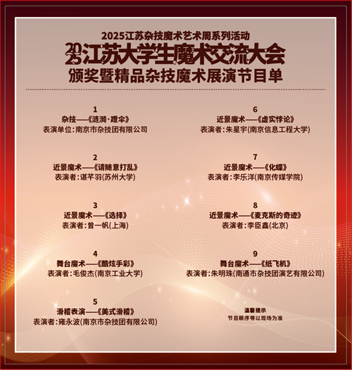 2025江苏大学生魔术交流大会由江苏省文联主办,江苏省杂协、南京市杂协、栖霞区文联承办,南京警察学院、江苏高校魔术社团联盟、奇幻森林(南京)公司等共同协办。活动共评出冠军1名、亚军2名、季军3名,优秀节目9个,充分展示了江苏高校魔术人才的发展成果。