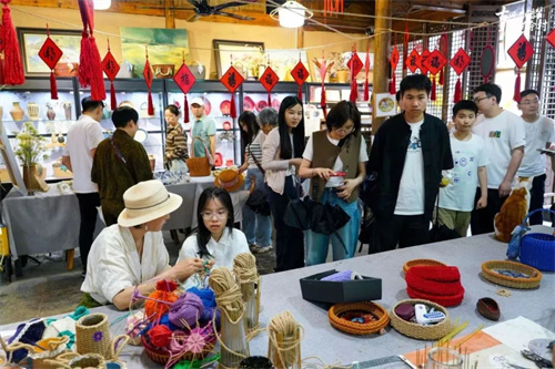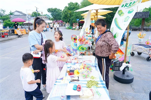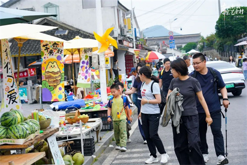 村头的“家风广场”在节日里摇身一变,成为热闹非凡的“烟火佘村·艺术菜场”。数十个摊位中,农产品、美学手作与本地美食一齐陈列,激发“农业文明”与“青年文化”的深度联动。节日+市集+艺术的混合模式,为乡村消费空间注入创意活力,成为乡村文旅融合的崭新尝试。