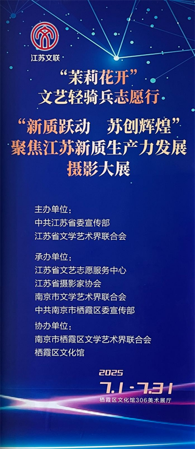 7月1日,由中共江苏省委宣传部,江苏省文学艺术界联合会主办,江苏省文艺志愿服务中心、江苏省摄影家协会、南京市文学艺术界联合会、中共南京市栖霞区委宣传部承办,南京市栖霞区文学艺术界联合会、栖霞区文化馆协办的优秀文艺成果共享工程暨“茉莉花开”文艺轻骑兵志愿行——“新质跃动 苏创辉煌”聚焦江苏省新质生产力发展摄影大展在栖霞区文化馆开展。