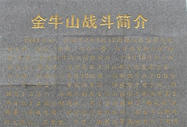 1941年4月16日,新四军二师四旅十二团在金牛山休整时遭日伪军突袭。该团运用“梅花桩”战术反包围敌军,经大陈庄、五里墩等激战追击至尹家河,毙伤日伪军500余人,缴获重机枪等武器。