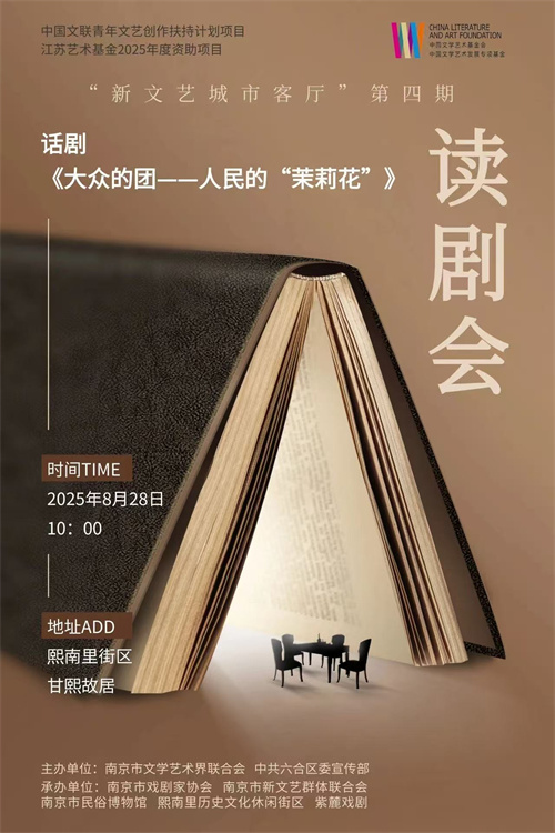 8月28日,“新文艺城市客厅”第四期——话剧《大众的团——人民的“茉莉花”》读剧会将在熙南里街区甘熙故居举办。活动由南京市文学艺术界联合会、中共六合区委宣传部主办,南京市戏剧家协会、南京市新文艺群体联合会、南京市民俗博物馆、熙南里历史文化休闲街区、紫麓戏剧共同承办。