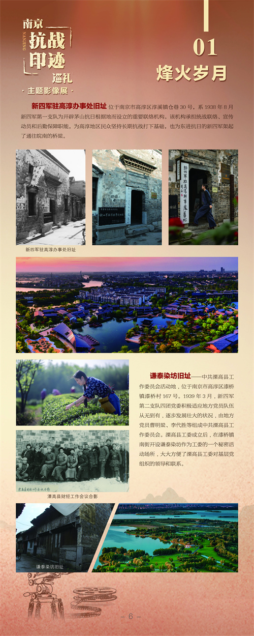 展览分为“烽火岁月”“浴血奋战”“复兴有我”三大板块,系统梳理并呈现了南京及周边地区的抗战历史与精神传承。通过200余张新老照片对比,实景展现了横山新四军革命纪念馆、溧高县抗日民主政府旧址群等爱国主义教育基地风貌,引导广大观展者铭记历史、珍爱和平、振兴中华。
