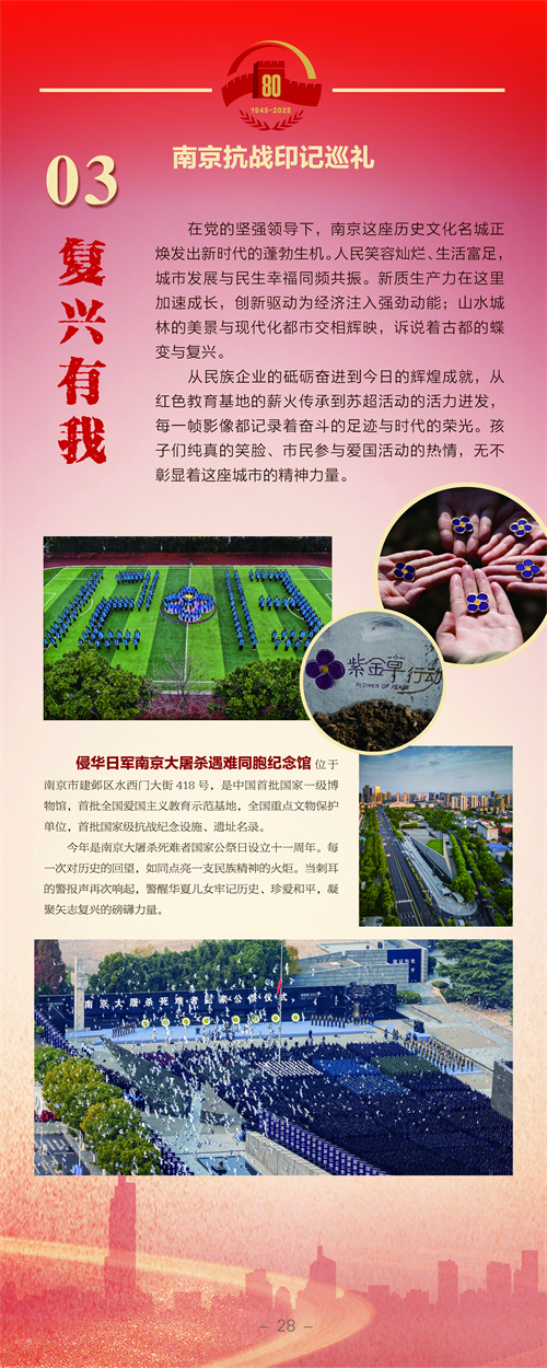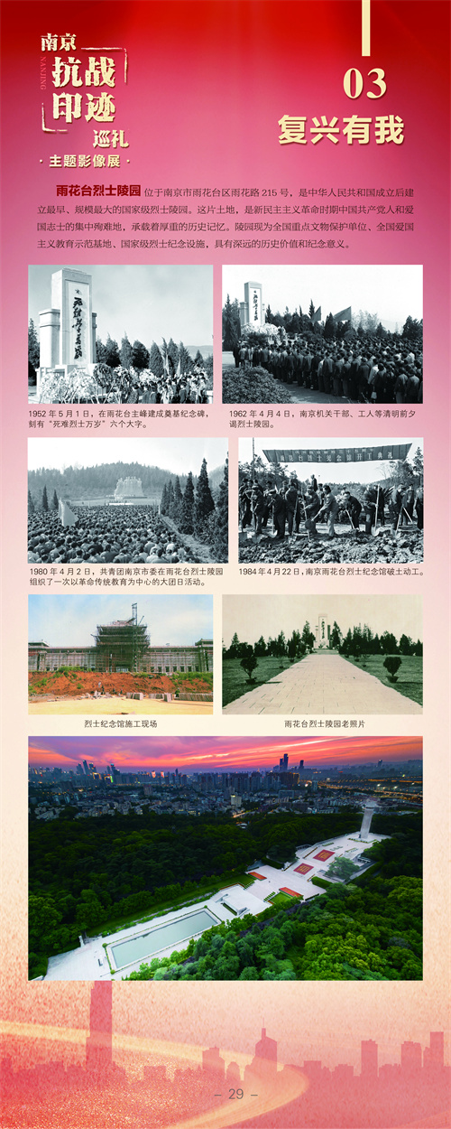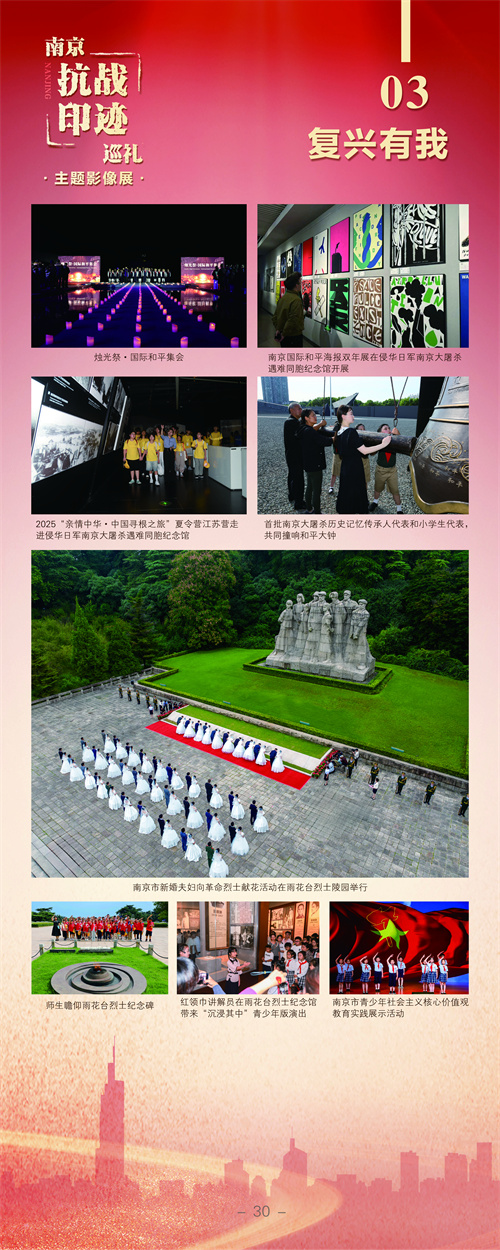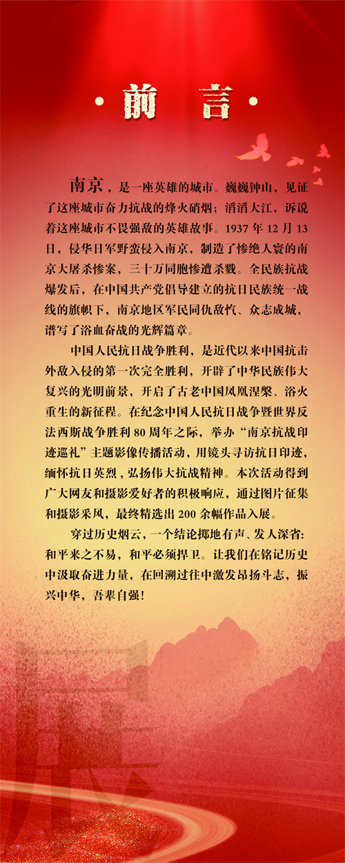 编者按:南京,是一座英雄的城市。巍巍钟山,见证了这座城市奋力抗战的烽火硝烟;滔滔大江,诉说着这座城市不畏强敌的英雄故事。在纪念中国人民抗日战争暨世界反法西斯战争胜利80周年之际,由南京市文联、南京市委网信办、南京市委党史办、南京市档案馆、雨花台烈士纪念馆联合主办,南京市摄影家协会、《金陵瞭望》杂志社承办的“南京抗战印迹巡礼”主题影像展在雨花台烈士纪念馆开展,用镜头寻访抗日印迹,缅怀抗日英烈,弘扬伟大抗战精神。