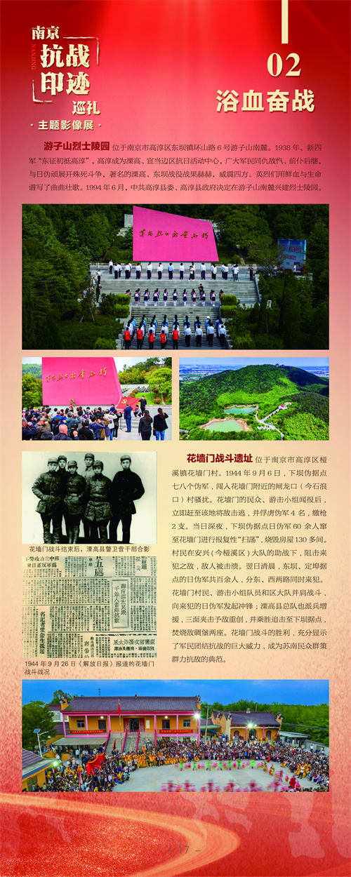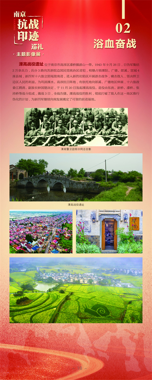 展览分为“烽火岁月”“浴血奋战”“复兴有我”三大板块,系统梳理并呈现了南京及周边地区的抗战历史与精神传承。通过200余张新老照片对比,实景展现了横山新四军革命纪念馆、溧高县抗日民主政府旧址群等爱国主义教育基地风貌,引导广大观展者铭记历史、珍爱和平、振兴中华。