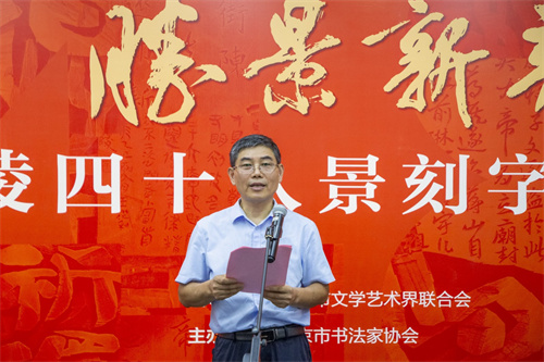 9月7日上午,由南京市文学艺术界联合会指导,南京市书法家协会主办,南京市书法家协会刻字委员会承办的“胜景新韵·金陵四十八景刻字艺术展”在南京美术馆开幕。南京市文联党组书记、常务副主席陈政宣布展览开幕。南京市文联党组成员、副主席李志平、王子出席开幕式。南京市文联副主席、南京市书法家协会主席谢少承向展览开幕表示祝贺。中国书法家协会行书委员会委员、南京市书法家协会执行主席朱敏致辞,南京市书法家协会副主席邱世鸿、何震宇、陈克年,以及参展作者、观众等近百人参加开幕式。开幕式由陈克年主持。