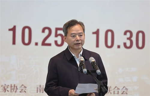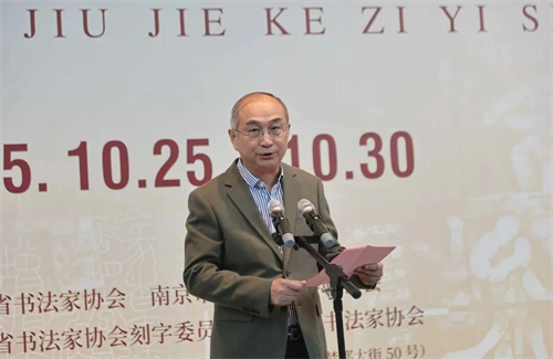 刘灿铭在发言中谈到本届展览共征集来自全省13个设区市的1286件作品,经初评、复评、终评、文字审读与抽查面试环节,最终评选出147件入展作品,其中包括13件优秀作品和14件优秀提名作品。展览作品在材质与艺术表现上实现双重突破,陶刻、竹刻等综合材料广泛应用,凸显“书刻同美”“书刻同风”的创作理念,集中展现了江苏刻字艺术守正创新、多元融合的时代风貌,为传统书法与刻字艺术注入新的生机与活力。