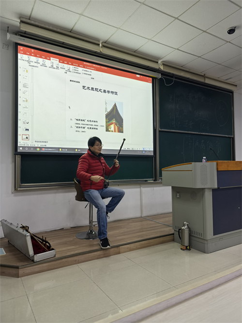 林教授从“何谓国乐”出发,围绕国乐的文化根源、艺术特征与当代价值展开深入讲解。他指出,国乐不仅是艺术形式,更是中华文明的精神载体。理解国乐,是青年学子链接传统与当下、厚植文化自信的重要途径。他重点解析了国乐“近人声之音色”“五声性之音调”“线性化之旋律”三大音乐形态特征,从“丝不如竹,竹不如肉”这一流传千年的古语切入,生动阐释了国乐音色“近人声”的审美追求,强调了中国音乐中以人声为贵、器乐效法人声的深厚传统。同时,他结合《渔舟唱晚》《广陵散》等经典作品,分析了“五声性”音调中蕴含的东方哲学思维,以及“线性化”旋律展现的,与中国书画艺术相通的写意精神。为让抽象的音乐理论更直观,林教授还手持二胡现场演奏示范,用灵动的乐音具象化呈现国乐特质。