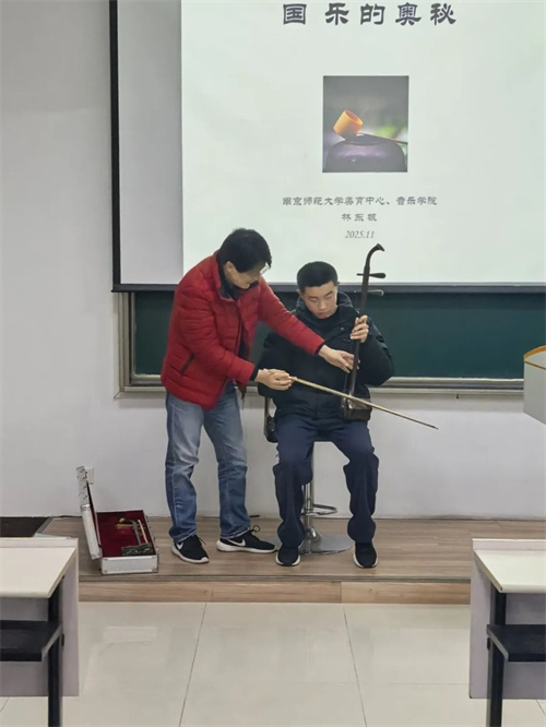 在艺术表现层面,林教授提炼出国乐五大美学特征,分别是“相反相成”的艺术法则、“变动不居”的表演特性、“平和儒雅”的艺术气质、“兼容并蓄”的包容特质与“幽远深邃”的意境之美。他强调,国乐作为儒家进取精神与道家自由思想的文化载体,不仅是纯粹的音乐艺术,更是承载民族精神的文化现象,其“以和为美”的美学思想对完整人格塑造与艺术创造具有重要意义。他呼吁青年学子以“民族性为根、创新性为本”,在坚守传统与对话多元中传承国乐文脉。讲座尾声,林教授还邀请学生登台尝试演奏二胡,让学生亲身感受国乐演奏的细节与魅力。