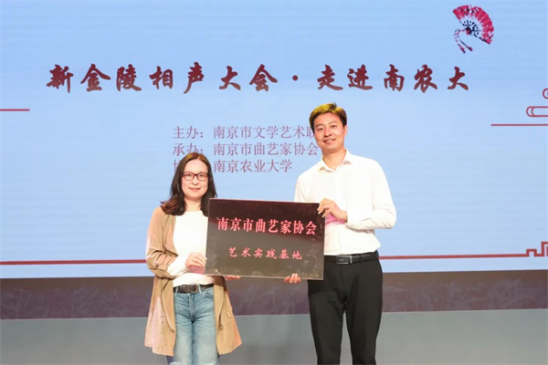演出开始前,毛敏代表南京市文联向南京农业大学颁发“南京市曲艺家协会艺术实践基地”铭牌。基地的设立,旨在通过相声等曲艺艺术,加强校地融合交流,丰富校园文化,让更多的青年了解、喜爱并传承中华优秀传统文化。