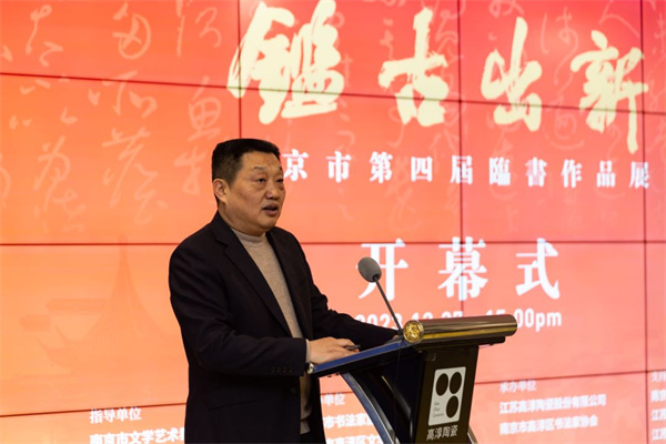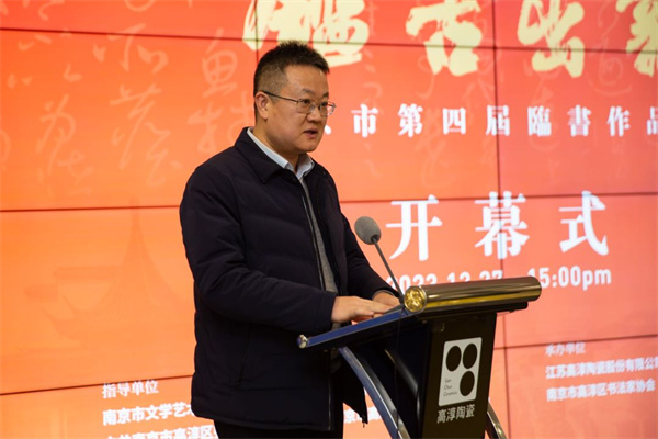 2023年12月27日下午,由南京市文学艺术界联合会、中共南京市高淳区委宣传部指导,南京市书法家协会、南京市高淳区文学艺术界联合会主办,南京市高淳区书法家协会、江苏高淳陶瓷股份有限公司承办的“鉴古出新”南京市第四届临书作品展在高淳陶瓷博物馆隆重开幕。南京市文联党组书记、常务副主席陈政,市文联党组成员、副主席毛敏,高淳区委常委、宣传部部长、文联主席杨勇,高淳区人大常委会副主任胡长明,高淳区政协副主席邢先文,江苏省书协副主席、南京市书协主席谢少承,南京市书协执行主席朱敏出席开幕式。