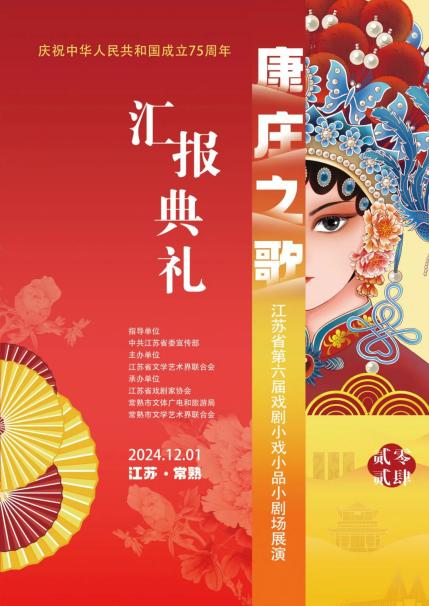 12月1日,庆祝中华人民共和国成立75周年——“康庄之歌”江苏省第六届戏剧小戏小品小剧场展演在常熟大剧院举办汇报典礼。在本届展演活动中,来自全省各地的49部小戏、小品和9部优秀的小剧场作品与大家轮番见面。这些作品题材广泛、风格各异,既有反映现实生活、弘扬社会正能量的佳作,也有挖掘历史文化、展现民族风情的力作。经过8天14场的演出,角逐出优秀剧目、优秀导演、优秀表演、优秀编剧、优秀舞美、优秀音乐等多个奖项。南京市戏剧家协会组织10个节目参加展演终评,喜获9项大奖。
