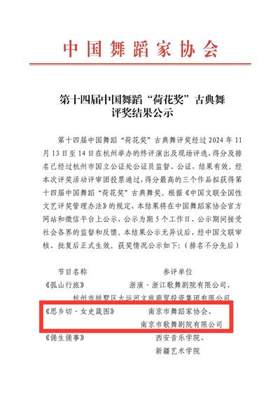 12月4日,第十四届中国舞蹈“荷花奖”古典舞评奖结果公示,由南京市舞蹈家协会、南京市歌舞剧院有限公司共同创作的舞蹈作品《思乡切·女史箴图》位列其中。