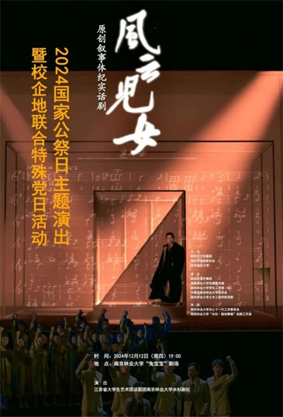 12月11日、12日,作为2024年国家公祭日主题演出活动之一,原创纪实话剧《风云儿女》在南京林业大学水杉“兔宝宝”剧场上演。演出由南京林业大学、南京市文投集团、南京市戏剧家协会主办,南京市演艺集团和南京林业大学党委宣传部、学生工作部(处)、团委、土木工程学院党委承办,南京林业大学关心下一代工作委员会、“水杉·剧动青春”戏剧工作室协办。