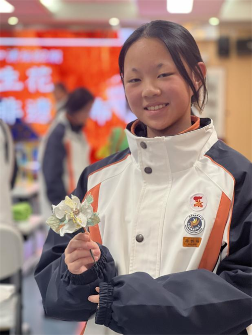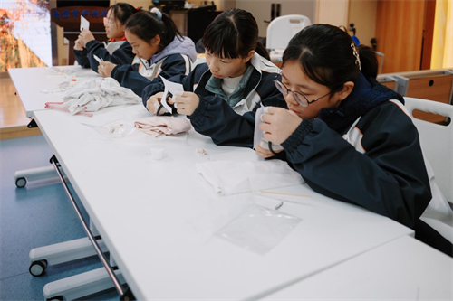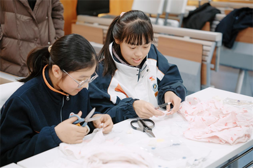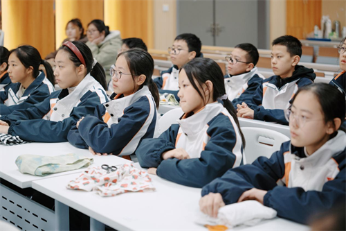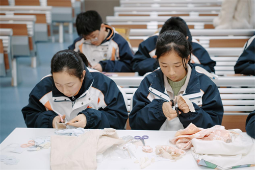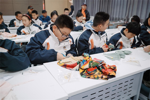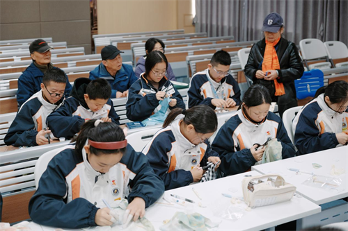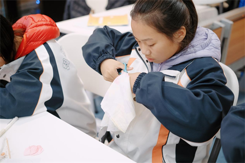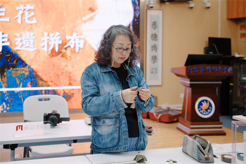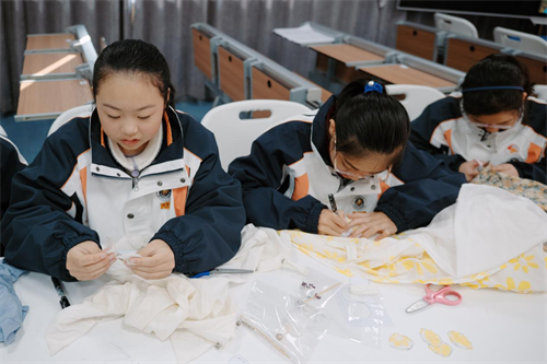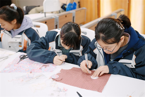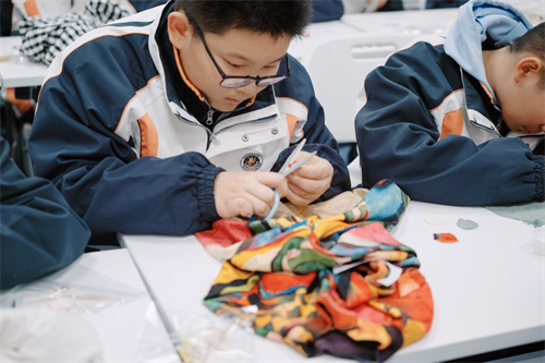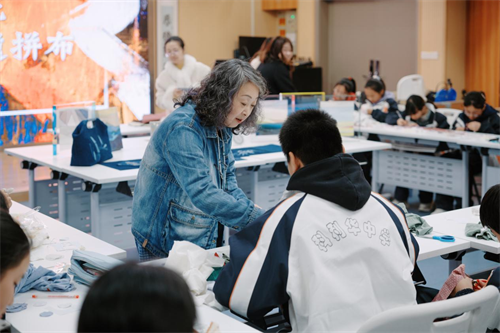 课上,张绍玲老师为同学们导赏了拼布艺术作品,详细介绍了拼布艺术的发展历史和技术要领,指导同学们利用旧衣布料动手制作拼布胸花,引导同学们以开放的态度和敏锐的洞见探讨中华优秀传统文化在当代的传承发扬。同学们通过观赏艺术作品、学习艺术理论、体验艺术创作,感受凝结在民间艺术中厚重的历史和先民的智慧,领会南京传统民间技艺的独特审美魅力。