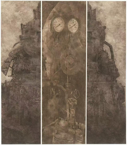 《时代的印记》是艺术家孙文烨以铜版为媒介创作的艺术力作,深刻展现了工业时代的缩影。老建筑、遗迹、火车头、车轮是他颇具个人色彩的一批铜版画作品,这些元素不仅是工业文明的象征,也承载着他对历史与时代的独特思考。铜版的印痕赋予这些意象深刻的象征意义,既体现了东北大地的粗犷与厚重,又在近身细观时,透过那些或清晰或模糊的划痕与墨迹,流露出江南般的细腻与韵味。在《时代的印记》这幅作品中,孙文烨通过铜版画的独特语言,将历史的沧桑与时代的变迁凝练于方寸之间,既展现了工业文明的辉煌与衰落,也唤起了观者对时间流逝与记忆传承的深刻共鸣。