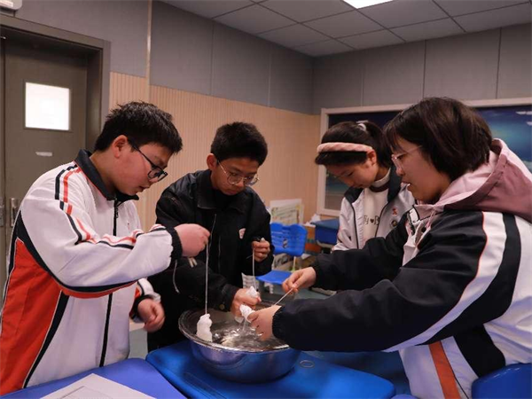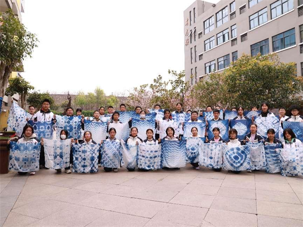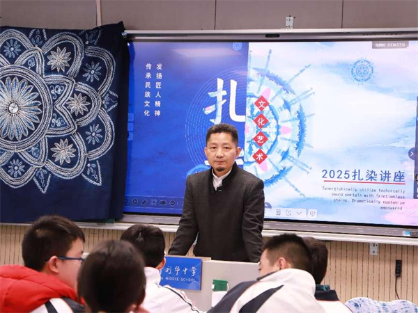 三月最后一场活动,美术馆公教团队走进科利华中学,为学生们带来一堂趣味盎然的扎染课。在朱建东与武晓慧老师的指导下,孩子们用皮筋、木夹与染料,将素白布料变幻出独一无二的蓝白纹样。扎结时的期待、拆解时的惊喜、成品展示时的自豪……这堂“流动的美育课”不仅让学生感受到传统手工艺的乐趣,更让艺术的种子在校园生根发芽。