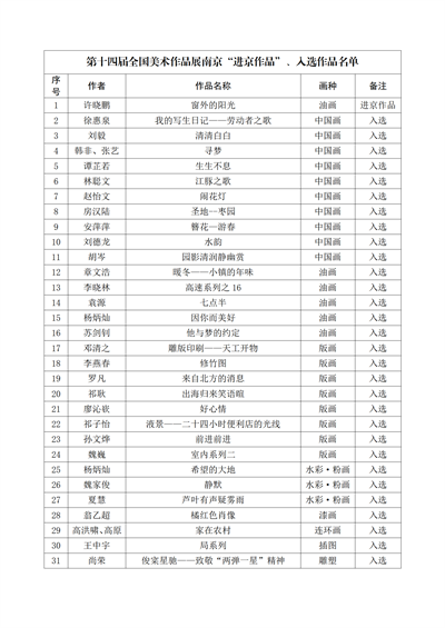 近日,第十四届全国美术作品展评选结果公布,南京市美术家协会的创作骨干们表现卓越,取得了很好的成绩:共有31件作品入选,包括中国画作品10件、油画作品6件、版画作品8件、水彩·粉画作品3件、漆画作品1件、连环画作品1件、插图1件、雕塑作品1件。其中,油画《窗外的阳光》获评“进京作品”。