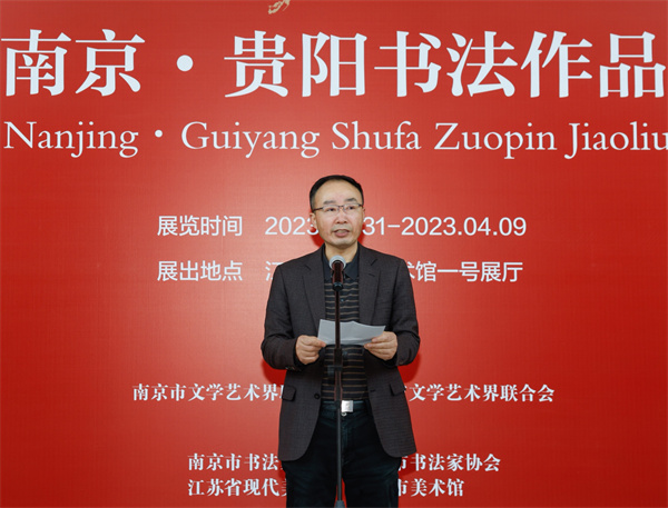 3月31日,由南京市文联、贵阳市文联主办,南京市书协、贵阳市书协承办的“山水共秀 翰墨同歌”南京·贵阳书法作品交流展在江苏省现代美术馆隆重开幕。南京市文联党组书记、常务副主席任家龙,贵阳市文联二级调研员徐爽,江苏省文联四级调研员潘永斯,南京市书协主席谢少承,贵阳市书协主席朱俊首,南京市书协执行主席朱敏,及两地相关领导与书法家代表出席开幕式。开幕式由南京市文联二级巡视员张跃定主持。