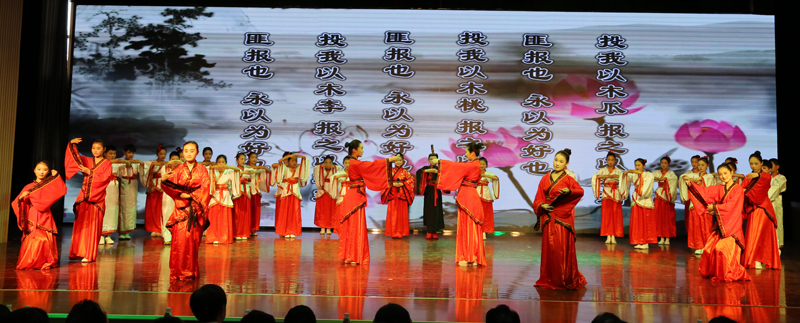 诗会以泗阳实验小学师生诗画交融的节目《诗经·木瓜》《天之大》作为开场。《木瓜》是《诗经·卫风》中的名篇,我华夏民族为泱泱大国、礼仪之邦,以《木瓜》开篇,正彰显了泗阳诗人热情待客的礼仪之道;“投我以木瓜,报之以琼琚。匪报也,永以为好也”,在小朋友们从容不迫的表演和声情并茂的朗诵中,现场观众为之深深震撼和感动。《天之大》则以母爱为题材,中间穿插以林徽因诗歌《你是人间的四月天》朗诵,一诗一歌的唯美表演,令人热泪盈眶。两个开场节目由古而今,创意精巧,在大气磅礴的舞台效果和情景交融的文艺表演中,“踏歌成子湖·五月诗会”盛大开幕。