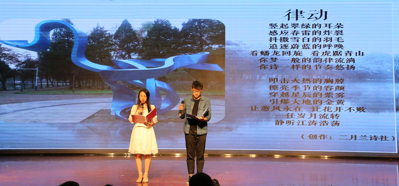 清泉般柔美的乐声在会场静静流淌,精神抖擞的诗人们纷纷闪亮登台;诗歌与音乐交替穿插,精彩纷呈的朗诵,为这生机蓬勃的五月增添了一抹抹亮色。本届诗会分“春风破”“一条河流向我奔来”“秋月别枝”三章,在男女主持人激情飞扬的介绍中,诗会进入第一章“春风破”。该章以南京理工大学二月兰诗社原创诗作《律动》为开场,诗社社员王禹杰、张娜娜激情朗诵:“竖起翠绿的耳朵/感应春雷的炸裂/抖擞雪白的羽毛/追逐蔚蓝的呼唤/看蟠龙回旋 看虎踞青山/你梦一般的韵律流淌/你诗一样的节奏悠扬”,一系列饱满明朗的青春意象昭示着:青葱少年,风发意气,生命的旋律就如春雷炸裂时的巨响,如海风激荡时的浪潮,充满勃勃生机。接下来,方政、海马、南音、束向红、土牛等诗人的文本联翩而来。著名诗人方政首先朗诵了自己的作品《卫星地图》《情爱如酒》,并和现场观众分享了这两首诗的创作经历,“情爱如酒/浅尝/颊齿留香/小酌/韵味悠长”,诗人的诗篇亦如醉人的佳酿,远远闻着,便已沁人心脾;“云在空中,从来都是身不由己,/许多时候,也只好随波逐流”,属于云的世界被诗人束向红细细描摹,深情朗诵,令我们感动于“云的泪水”,也为云的未来深深担忧着;“那些雪,被叫做残雪/它们折断了翅膀/早已不再会飞”,诗人海马笔下的雪,带着淡淡的忧伤气息,在声乐交融中,缓缓展开它最美的身姿;“我们在剥取回忆/一层层的深处/都有一个更小的自己/直至,到最后/与那个最小的,洁白的婴儿相遇/我们早已泪流满面”,女诗人南音的《剥洋葱》从生活的微小细节中捕捉到诗的意趣;“我的祖国,我是农民,活在祖国的大地上/我的祖国,我是农民,祖国在我生命之上”,南京乡间诗社社长土牛的这首《祖国在我生命之上》,激昂顿挫,彰显一颗拳拳赤子心。