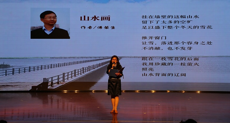 诗会第二章“一条河流向我奔来”,带来的是本次诗会主办方“成子湖诗歌部落”的诗歌作品。美丽的成子湖与洪泽湖相邻,盛产红菱、白藕和诗歌,近年形成了以傅荣生、巩大兵、阿尔芒、张家龙等12位诗人组成的诗歌部落,该部落成员作品以其简约、朴真和纯粹的风格,正日益引起诗坛关注。“草丛里的虫鸣/替人间/说出了大片的苦”,“我用珍藏的一粒萤火/照亮/山水背面的辽阔”,“老戏台的铜锣/悬于剧情的岩壁”……在深情的诵读中,傅荣生的诗作《人间》《铜锣》《山水画》,短小精悍地表达了对生活的感悟,以其细致观察与睿智思考,予人以深刻启迪;巩大兵的《芳邻》写道:“我想用经年的白发/在紧邻的枝丫上搭巢/与桃树一起听风听雨听虫鸣”,涓涓细流般润泽心灵的朗诵,在现场营造出温暖而美好的气氛;阿尔芒的《读一首诗:伤口》与张家龙的《迷路的父亲》,让观众感动于诗人对父亲的追思;南阳的《江南之约》颇为沉醉地勾勒出素纱轻笼、婉约灵动的江南美景;张建国的《老宅》表现了对童年、亲人与老宅的回忆;胡海燕的《思无邪》寄托了无限美好的情思。之后,胡巧云的《桃花渡》写出了爱情的孤独与狂欢;崔树田的《开镰》以奇特角度表现了麦收时的喜悦;田千武的《雪一样的梨花》清香秀美;陈宇的《汨罗江》萦绕着永恒的沉思;陈德贵的《给鸟儿发短信》浪漫唯美,意想天开。诗人们的作品像是一杯杯甘醇的酒浆,愈品愈觉其芳香馥郁。“成子湖诗歌部落”的作品展示,以其别开生面一往深情,在现场引起了热烈反响。