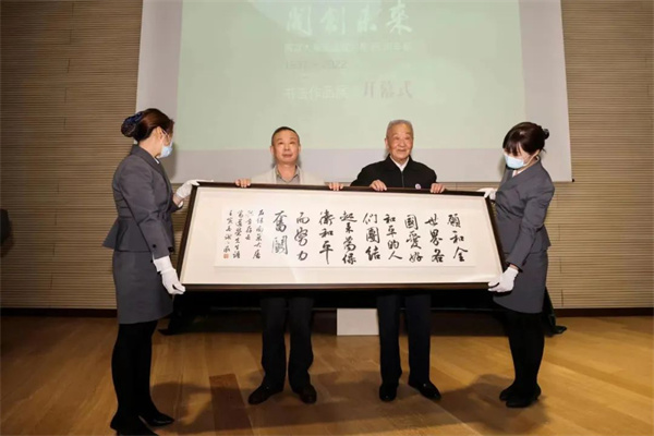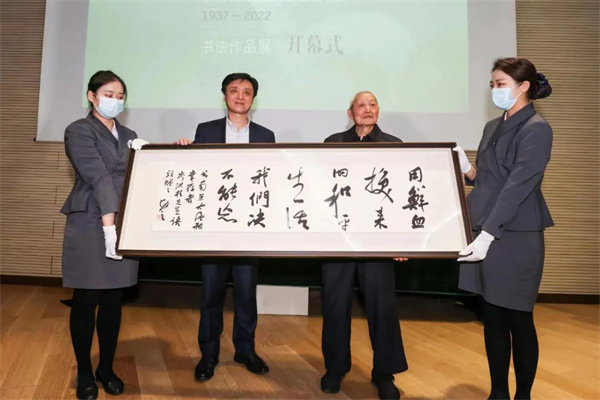 开幕式由纪念馆副馆长凌曦主持。开幕式上,纪念馆副馆长时鹏程向书法家代表颁发收藏证书。南京市文联⼀级调研员张跃定、南京市书法家协会执行主席朱敏分别向南京⼤屠杀幸存者代表葛道荣、岑洪桂赠送了书法作品。