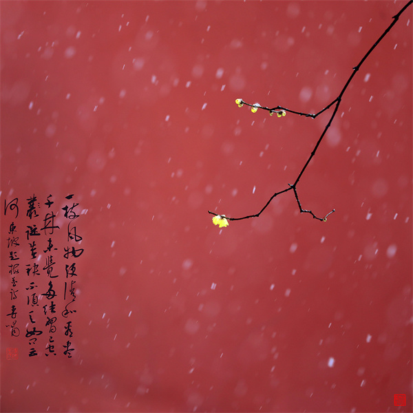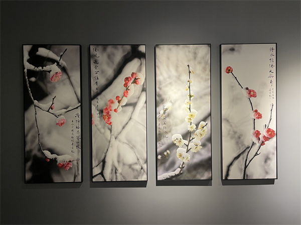 书香、墨香、花香,展览现场共展陈梅花主题的摄影作品百余件,其中三十余幅是由江苏省书法院院长李啸与江苏省摄影家协会副主席、南京市摄影家协会主席屠国啸联袂创作的书影合璧作品。在创作中,李啸先生一直在考虑,诗句与画面主体之间有无内在逻辑,能否将潜藏其中的诗境导引出来?题写于何处?选用何种字体?甚至落款的巧思、钤印的位置等等,解决这些问题就像是一场艰苦的恋爱,双方不断在试探对方的底线,在坚持中让步,在争议中和解,最终实现和美。